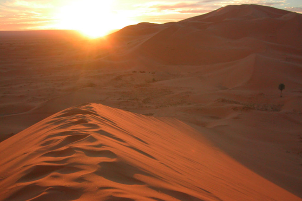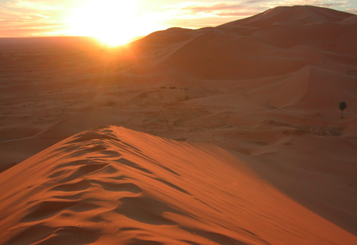 | 5日目 | 午前 | 【ロッジ泊】 ラクダに30分ほど揺られて日の出見学へ。 その後、ロッジにて朝食。 【キャンプ泊】 キャンプ地背後の大砂丘に登り、日の出見学。 キャンプ地にて朝食後、1時間半ほどラクダに揺られて ロッジへ。ロッジを出発し、英語ドライバーと一緒に専用車にて ティネリール経由でトドラ谷へ。 |